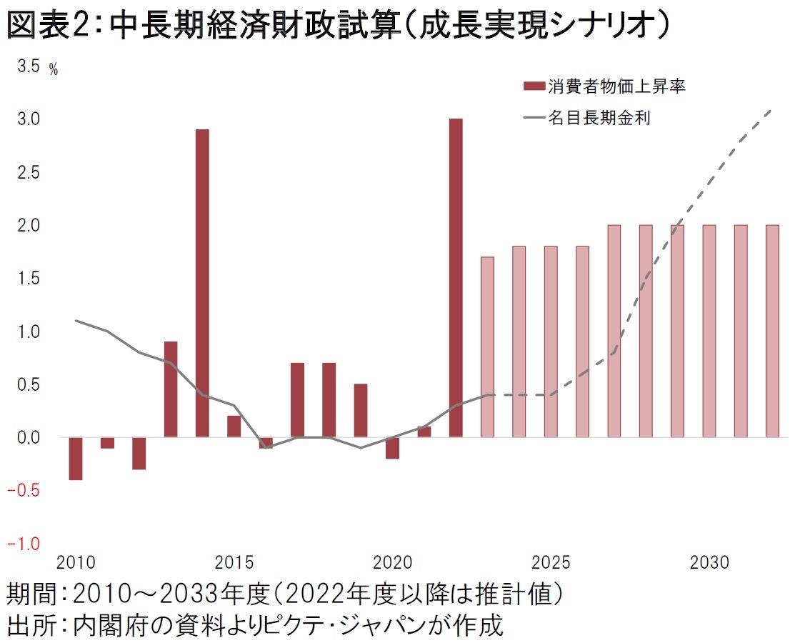 1月24日、内閣府が経済財政諮問会議に提出した『中長期経済財政試算』によれば、メインシナリオである「成長実現シナリオの場合でも、2026年度まで名目長期金利は0.6%での推移が見込まれていた(図表2)。