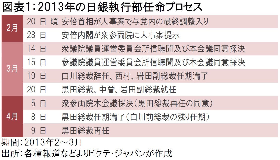 ちなみに、2013年に黒田総裁が任命された際には、国会への人事案提示が2月28日、衆議院、参議院での同意プロセスが3月14、15日だった(図表1)。