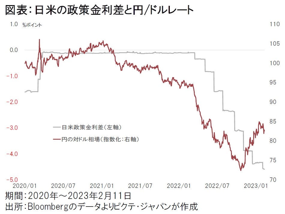 2つ目の売り圧力は円に対してだ。昨年11月以降の円反落は、2023年における米国の利下げ及び日銀の利上げ観測を背景としていた。米国は雇用が堅調で景気は底堅く、利上げは峠を越えたとしても、FRBによる早期の利下げはなさそうだ。一方、日本は新総裁の下でも現在の緩和基調が続く可能性が強い(図表)。つまり、昨年のドル高・円安要因は、今も本質的には変わっていないのではないか。