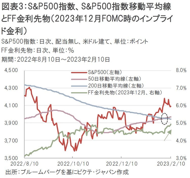FRBは昨年3月から今年2月までに計8回の利上げを行っており、FRBの政策金利であるフェデラル・ファンド(FF)金利の誘導目標は直近4.50~4.75%へ達している。また、FF金利先物では、今年の年央までにあと0.5%程度の利上げが織り込まれているので、足元の状況は金融引き締め局面と考えられる。一方、市場関係者は年後半の利下げを予想しているので、S&P500指数の「ゴールデン・クロス」形成は金融緩和を織り込んだ値動きとも解釈できなくはないが、2月3日に発表された米雇用統計をきっかけにFF金利先物(2023年12月FOMC時のインプライド金利)は足元で上昇に転じており、むしろ利下げ期待は急速に後退している(図表3)。