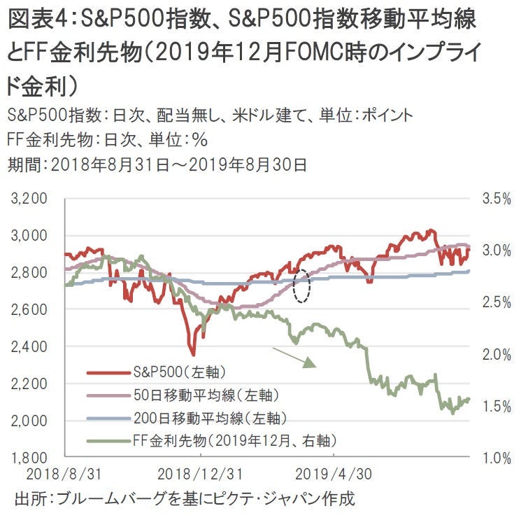 ベアマーケット入りはしていないが、今回のようにFF金利の誘導目標が2015年10月時点の0.00~0.25%から2018年12月時点の2.25~2.50%まで引き上げられた後に出現した2019年4月1日の「ゴールデン・クロス」はどうだったのだろうか?この時は2020年3月にコロナショックが発生(デッドクロスは2020年3月30日に形成)したため、バックテスト上のリターンはマイナスとなったが、「ゴールデン・クロス」が形成された直後のS&P500指数は比較的堅調に推移していた。しかし、この時はすでにFRBによる2019年後半の利下げが織り込まれていた時期でもあり、FF金利先物(2019年12月FOMC時のインプライド金利)も低下局面にあった(図表4)。