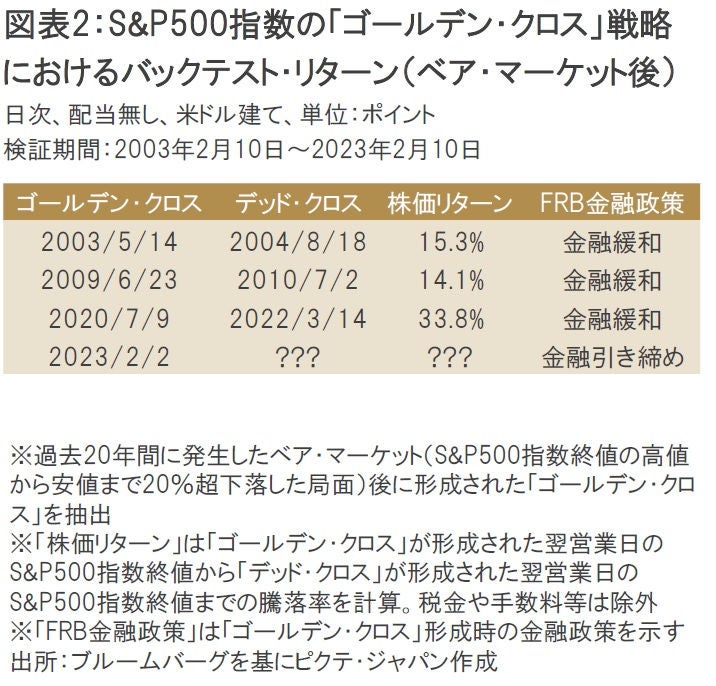 一般的に「ゴールデン・クロス」は強気シグナルと認識されており、「ゴールデン・クロス」形成後の株価は上昇しやすい傾向がある。実際、「ゴールデン・クロス」が形成された翌営業日の終値でS&P500指数を買い、「デッド・クロス(50日移動平均線が200日移動平均線を上から下へ突き抜ける現象)」が形成された翌営業日の終値でS&P500指数を売った場合の株価リターンを計算してみると、過去20年間のバックテストでは勝率7割となった(税金や手数料等は除外)。さらに、今回のようにS&P500指数がベア・マーケット(高値から安値まで20%超下落した局面)入りした後の「ゴールデン・クロス」に絞って検証すると、(サンプル数は少ないとは言え)勝率は100%にもなった(図表2)。