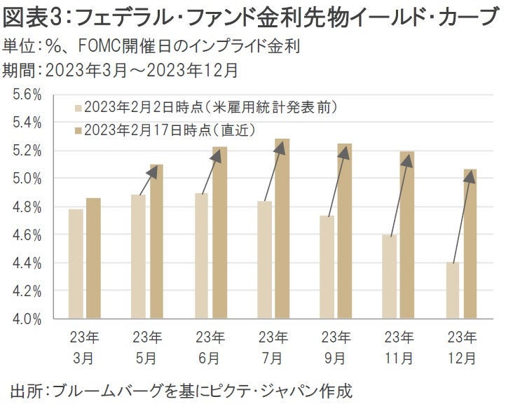米国の1月雇用統計や1月CPI に加え、1月小売売上高、1月PPI(生産者物価指数)がいずれも市場予想を上回ったことから、市場ではインフレ懸念が再燃する展開となった。このため、フェデラル・ファンド(FF)金利先物市場では、FRB(米国連邦準備制度理事会)による年後半の利下げ期待が急速に後退した(図表3)。