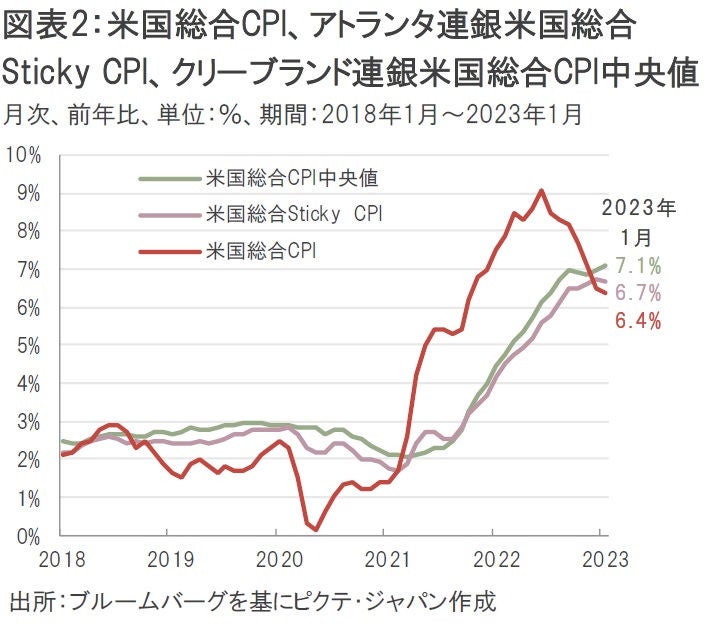 一方、インフレの基調を表す米国クリーブランド連銀が算出する米国総合CPIの中央値は前月の同+7.0%から今月は同+7.1%へやや加速したほか、米国アトランタ連銀が算出する粘着性の高い品目を集めた米国総合Sticky CPIは前月の同+6.7%から今月は同+6.7%と高止まりの状態となった(図表2)。