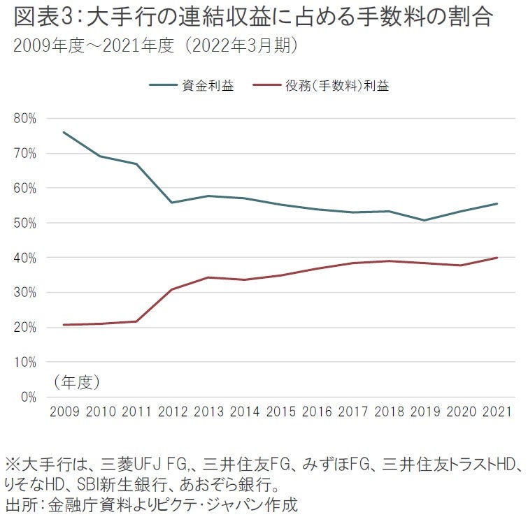 都市銀行(大手行グループの傘下銀行)の影響度は22%、地銀(第一地銀、同)の平均は49%と試算される。大手行の影響の方が小さい理由は、海外資産の割合が大きいことに加え、手数料比率の高さが挙げられる。いずれも前回の金利上昇時に比べて割合が上がっていることから(手数料収益の比率の推移を図表3に記載)、今後の金利上昇の大手行に対するインパクトは過去より小さくなっていると考えられる。