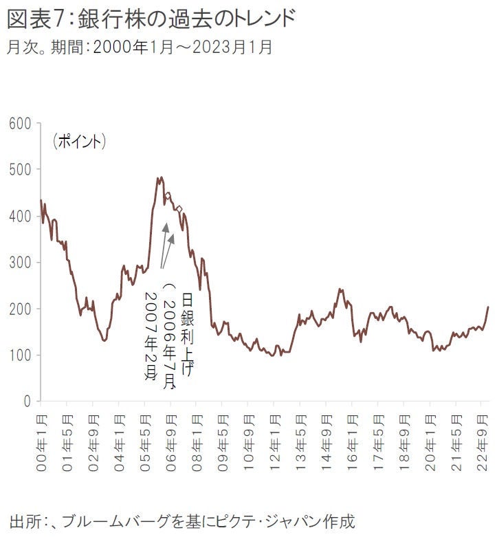 図表7の通り、過去の銀行株は日銀の政策金利変更までが最も強く、実際に利上げが始まった頃から下落し始めている。当面予想される政策変更は、政策変更ではなく、長期金利の事実上の引き上げであり、前例がないイベントとなる。このため、株価への影響も読みにくいが、やはり、YCC廃止発表の際には株価の動きに注意が必要だろう。