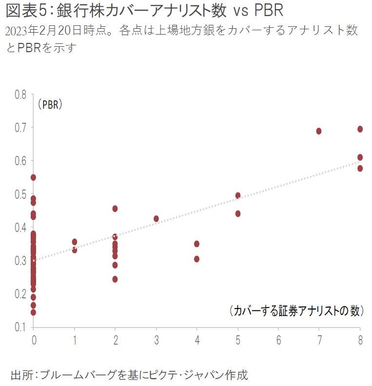 地銀の中ではどのような銀行にアップサイドが期待できるだろうか。銀行株のPBR(株価純資産倍率)の水準は、その銀行をカバーする証券アナリストの数と相関が高い(図表5。アナリスト数はブルームバーグベース)。