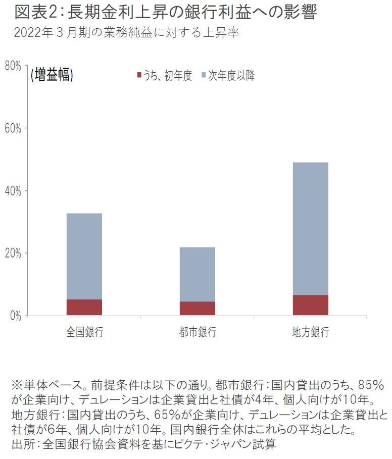 長期金利上昇の恩恵が完全に反映された時点では、全国銀行の平均で33%の増益となると計算される。長期金利上昇の影響は、債券や長期固定金利での貸出がロールオーバーされる時に段階的に出てくる。初年度の効果は資産のデュレーションに応じて完成年度の4~6分の1程度となる。
