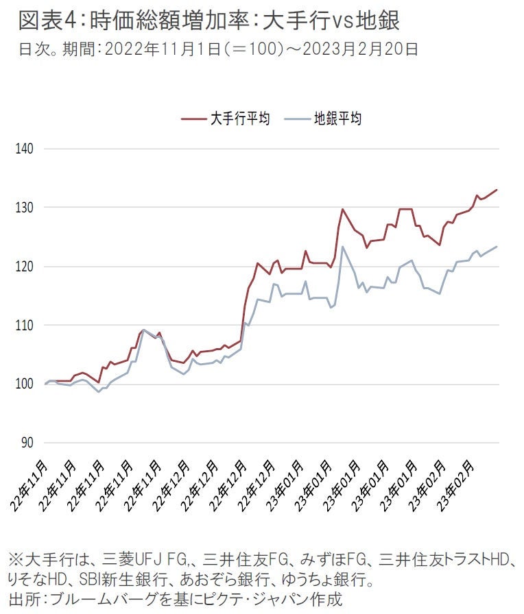 前掲図表2で示した通り、国内金利上昇の収益効果は、地銀の方が大きいが、その割に、11月以降の株価上昇率は、大手行の33%に対し地銀は23%と出遅れている(図表4。時価総額ベース)。