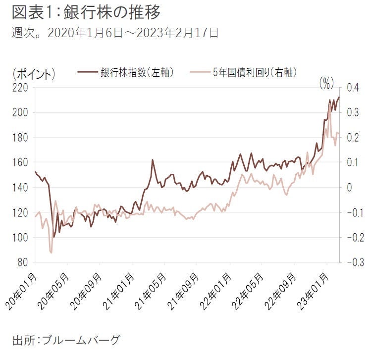 昨年後半以降、銀行株は金利上昇期待で久々に注目を集めている。昨年12月の日銀のイールドカーブコントロール(YCC)の変動幅拡大で勢いがつき、11月初頭からの上昇率は30%を超えている(図表1)。この上昇率は妥当なのか。更なるアップサイドはありうるのか。