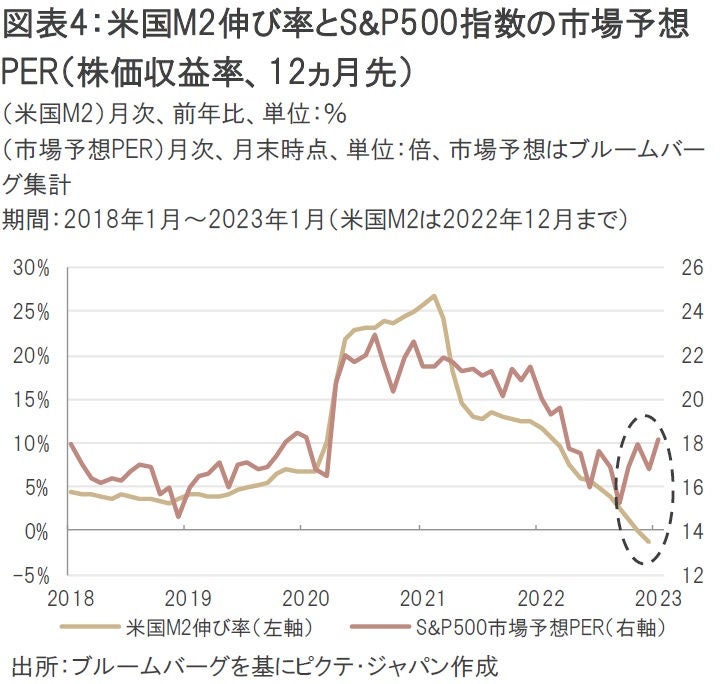 米国M2の縮小が米国の景気後退を引き起こす前提条件ではないと分かっても、M2の伸び率はS&P500指数の市場予想PER(株価収益率、12ヵ月先)に影響を及ぼす傾向があるため油断はできない。米国M2の伸び率が2020年2月時点の前年比+6.8%から2020年8月時点の同+23.0%へ急加速した際、S&P500指数の市場予想PERは16.8倍から22.9倍へ急上昇していた。反対に、FRBが金融引き締めに転じ、米国M2の伸び率が2021年12月時点の同+12.4%から2022年9月時点の同+2.6%へ急減速した際は、S&P500指数の市場予想PERは21.4倍から15.3倍へ急低下していた(図表4)。
