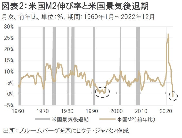 FRBの金融引き締めの影響が端的に現れているのが米国のM2(エムツー)だ。M2は通貨供給量(マネーサプライ)の一種であり、現金通貨や各種預金、個人向けMMF(マネー・マーケット・ファンド)などが含まれる。このM2は2022年12月に前年比1.3%減となり、1960年の統計開始以降、初めてマイナスとなる「異例」の事態となった。これだけ通貨供給量が縮小すれば景気後退が疑われてもおかしくない状況だが、実はそう単純ではない。過去の米国景気後退期と米国M2の伸び率を重ね合わせると、90年代前半は今回のようにM2の伸び率が鈍化していたにもかかわらず、景気後退入りはしていなかった。M2の伸び率鈍化が必ずしも景気後退を引き起こしている(又はその状態を示す)わけではないことが分かる(図表2)。