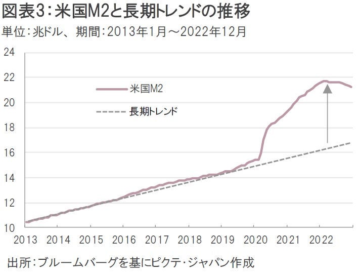 むしろ、足元のM2の状況は、コロナショックを背景としたFRBによる大規模な金融緩和によって引き起こされたマネー膨張の「反動減」と捉えるべきだろう。実際、2013年1月から2020年2月までのM2の増加ペースを長期トレンド(線形)と仮定すると、2020年3月から2022年3月にかけてM2が長期トレンドを大幅に上回っていることが見て取れる。コロナショック後の未曾有の金融緩和がそもそも「異例」だったと言えるだろう(図表3)。
