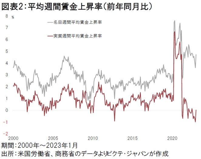 一方、足元の米国経済を見ると、エネルギー価格の影響が低減したことで物価上昇率が縮小し、実質賃金の伸びがプラスに転じてきた(図表2)。この状態であれば、かならずしもインフレを「悪い」と決め付けることはできないだろう。