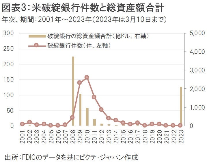 2023年3月10日時点における破綻銀行の総資産額はたった1行(SVB)で2,090億ドルにもなり、すでに2009年の水準(1,709億ドル)を超えている。一方、2009年当時の破綻銀行件数は140行にものぼることから、今後さらに破綻銀行が増加してもおかしくない状況だ(図表3)。