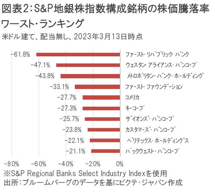 特に下落が目立ったのは、SVBと同様に預金保険対象外の預金を多く抱える米ファースト・リパブリック・バンクだ(図表2)。米当局による全預金保護の対象となる銀行は、SVBと12日に破綻したシグネチャー・バンクの2行のみであり、経営破綻に陥らない限り全預金保護は適用されない。米国株式市場では「次のSVB」探しが始まっており、悲運にもファースト・リパブリック・バンクがそのターゲットとなってしまった可能性がある。