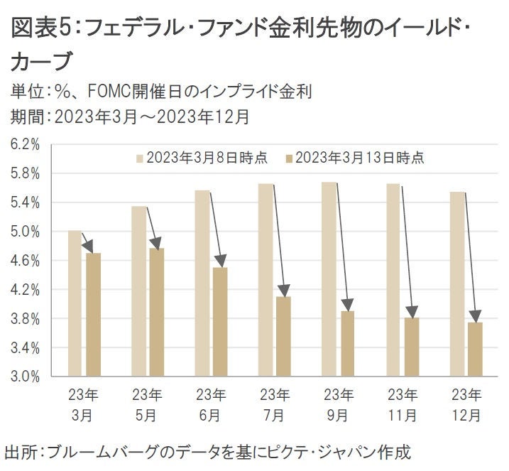 SVB破綻をきっかけとした金融不安を背景に、フェデラル・ファンド金利のターミナル・レート(利上げの最終到達点)の市場予想は3月8日時点の約5.7%から13日時点の約4.8%へ急低下したほか、年後半の利下げ観測も急速に高まっている(図表5)。