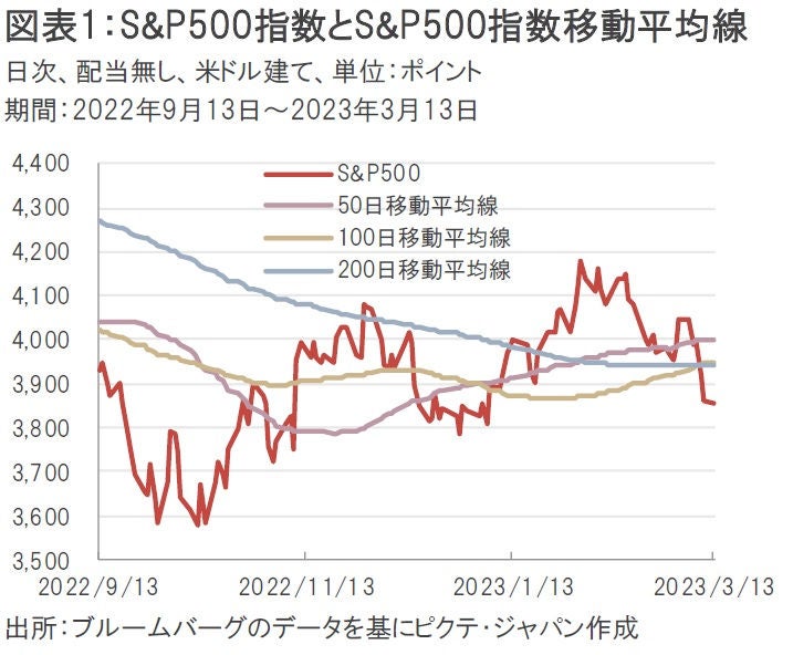 SVB(シリコン・バレー・バンク)が経営破綻した3月10日(金)からわずか2日後の12日(日)、米財務省、FRB(米連邦準備制度理事会)、FDIC(米連邦預金保険公社)は共同声明でSVBの預金全額を保護する異例の措置を発表した。さらに、FRBは米国債やMBS(住宅ローン担保証券)などを担保に流動性を供給する緊急融資枠も新設した。これを受け、13日のS&P500指数は前日比0.15%安にとどまったが(図表1)、地銀株の下落が止まることは無かった。