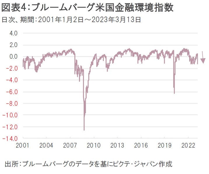 ヒントになるのは米国金融環境指数だ(3月7日発行の筆者レポート『「嵐の前の静けさ」か?米国金融環境指数は依然緩和的』では、週次のシカゴ連銀米国金融環境指数を使用したが、今回は速報性が高い日次のブルームバーグ米国金融環境指数を使用)。ブルームバーグ米国金融環境指数は3月10日にプラスの「緩和的」からマイナスの「引き締め的」へタイト化したばかりであり、まだタイト化の初期段階だと言える(図表4)。この指数がさらにマイナス(引き締め)方向へ進んだ場合、破綻銀行の数も増えることが予想されるため警戒が必要だ。