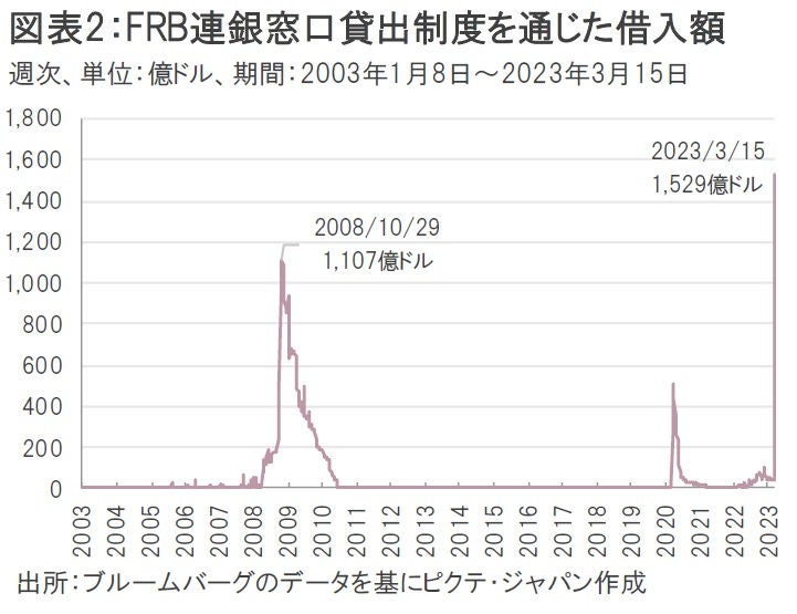 米金融システムの苦境を表すのが米国連邦準備制度理事会(FRB)の連銀窓口貸出制度を通じた借入額の急増だ。FRBが最後の貸し手として提供する同制度を銀行が利用することは「不名誉」とされがちだが、背に腹は代えられない状況なのだろう。3月15日までの1週間で銀行がFRBから借り入れた金額は1,529億ドルにものぼり、リーマンショック時のピークを優に上回った(図表2)。