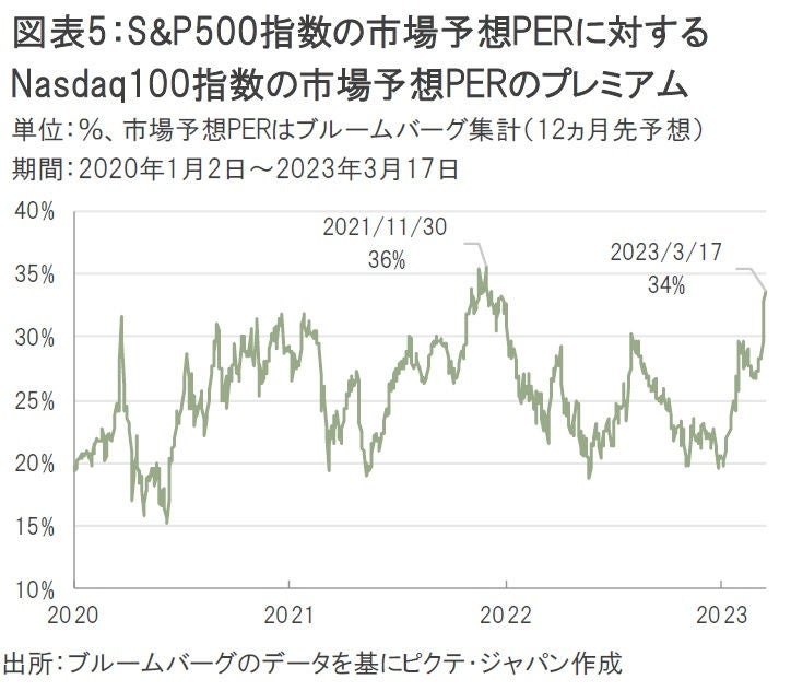 米国株式市場では、FRBの流動性供給やセクター・アロケーション(銀行株からIT株へのスイッチ)による影響等から、Nasdaq100指数は先週1週間で5.83%高とS&P500指数に対して極端な値動きとなっている。また、Nasdaq100指数の市場予想PER(株価収益率、12ヵ月先)は3月17日時点で23.3倍、S&P500指数の17.4倍に対して34%のプレミアムとなっており、すでに2021年11月30日に付けた36%のピーク水準まで近づきつつある(図表5)。引き続き米国株式市場の先行きについては慎重に見るべきだろう。