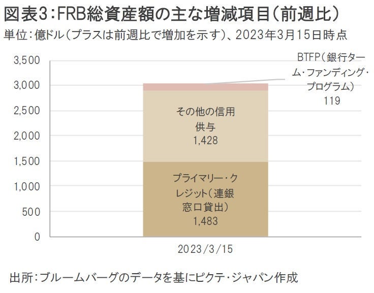 一方、3月12日に創設された銀行ターム・ファンディング・プログラム(BTFP)の利用状況にも注目が集まっていたが、こちらの借入額は119億ドルにとどまった(図表3)。