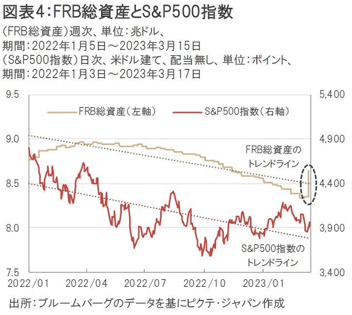 FRBは「量的引き締め」によって総資産を減少させる政策を行っており、S&P500指数もそれに連動するかたちで下落傾向が続いていた。しかし、前述した「連銀窓口貸出制度」や「その他の信用供与」の急増を受けてFRBの総資産は再び急拡大しており、株高材料としてポジティブに捉える向きもある(図表4)。