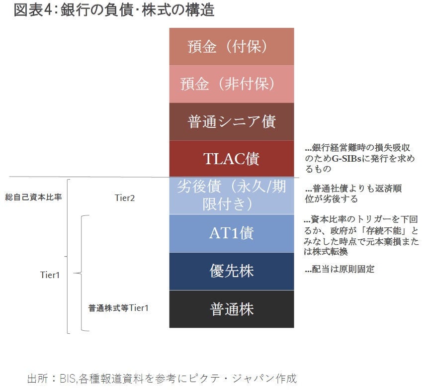 AT1債は、シニア債と株式の双方の要素を持つとしてハイブリッド証券とも呼ばれる(銀行の負債構造を図表4に掲載) 。主な条件は、1)永久債である、2)資本トリガー条件をヒットするか、当局が存続不能(non-viable)と認めたときに、株式に転換されるか、または価値がゼロになる、3)コール後に金利を引き上げ(ステップアップ)してはならないー などである。トリガー条件としては、CET1比率等が一定の比率(殆どの場合5.125%か7%)以下になった時と定められている。今回のCSのAT1債の減価は、トリガー条項ではなく、当局が存続不能と判断したことによると解釈されている。