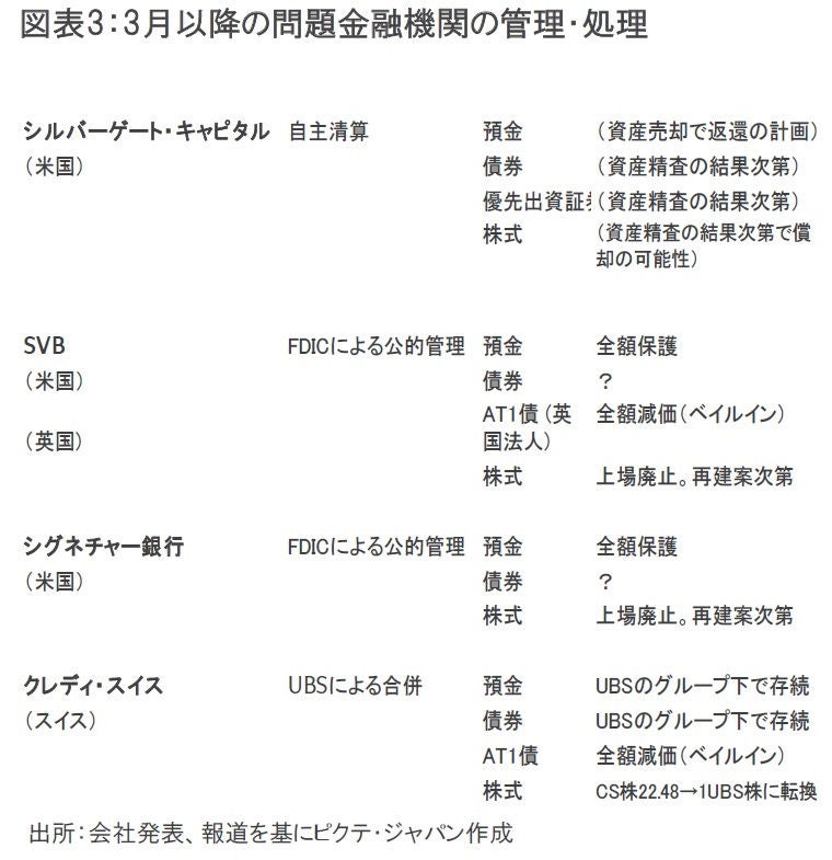 3月初旬以降の米欧金融機関の動揺で、これまで損失を被りつつあるのは、SVB英国法人とクレディ・スイスのAT1債保有者と、株価下落に見舞われた株式投資家である(図表3)。