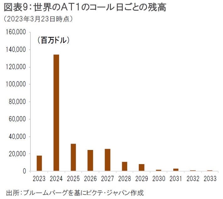 また、来年以降はAT1債のコールが集中しており(図表9)、もしそれまでにAT1債の市場の動揺が収まらないと、期限前償還が見送られることとなり、更なる不安を招きかねないだろう。