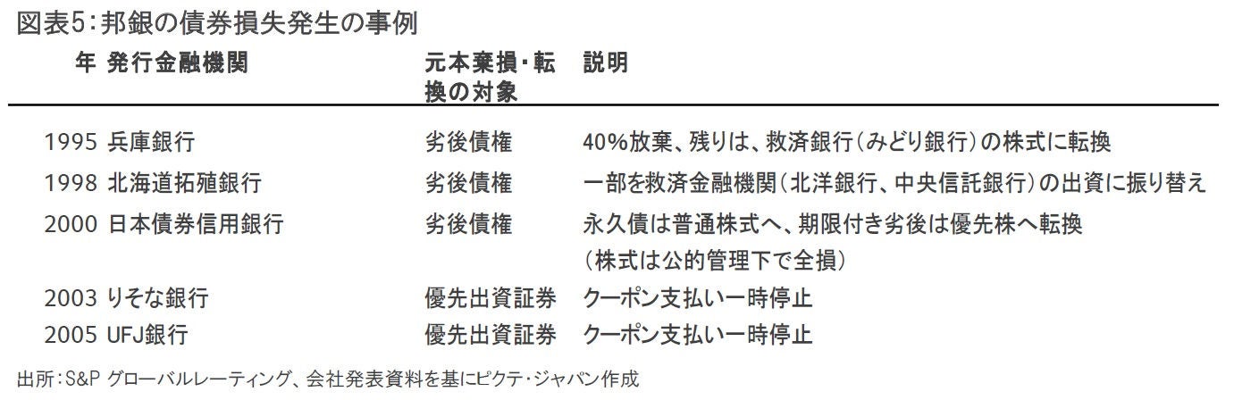 過去にも、ハイブリッド証券が棄損した事例はある。例えば、邦銀金融危機時の1990年代以降は、劣後債の元本償却が行われたり、Tier1に含まれる優先出資証券(別名OpCo証券)がクーポン支払いを一時停止した(図表5)。