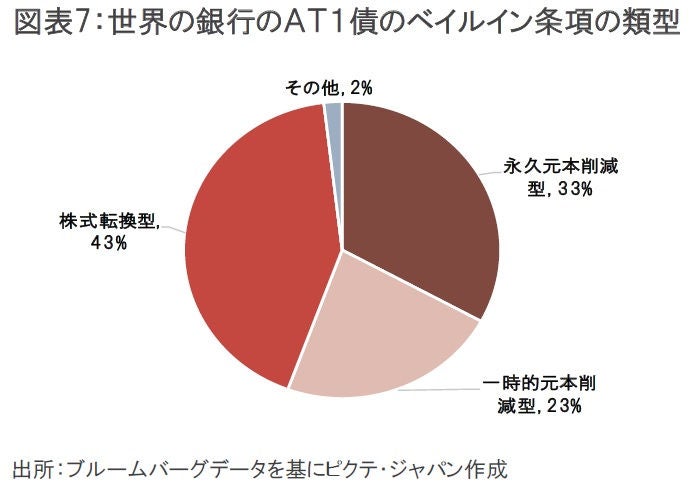 ところが、AT1債については、前述の通り、破綻未然の資本増強が目的でもあることから、CET1比率がまだプラスの段階から無価値になりうる一方で、株式はゼロにならないという、いびつな構造が残った。なお、この問題は、同じAT1債でも、株式転換型や一時的な元本削減型では生じにくくなるが、現在残高のあるAT1債の約3割はクレディ・スイスのような永久元本削減型となっている(図表7)。
