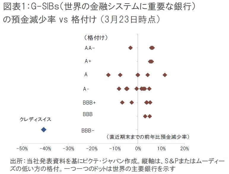 両社の共通項は、以前からの市場評価の低さと流動性への懸念である。昨年12月末時点で、クレディ・スイスが他のG-SIBsに比べて突出して弱かった点は、資本等の財務面よりは、預金の減少速度と、格付けの低さであった(図表1)。