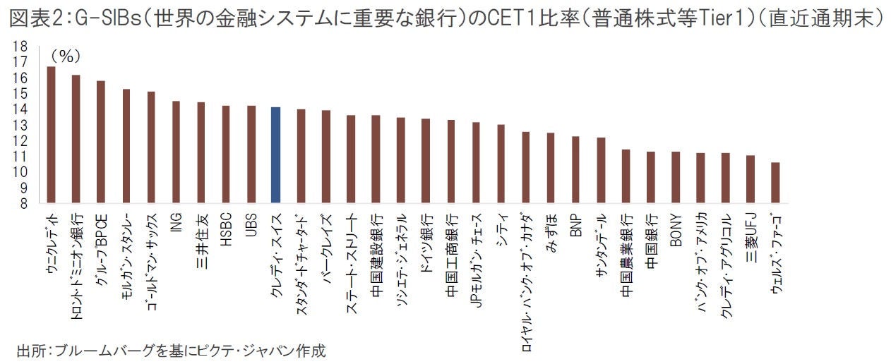 逆に資本比率については、11月から12月に行った40億スイスフラン(約5,700億円)の増資で、年末時点のクレディ・スイスの普通株式等Tier1比率(CET1比率)は14.1%と、全く問題がある水準ではなかった(図表2)。