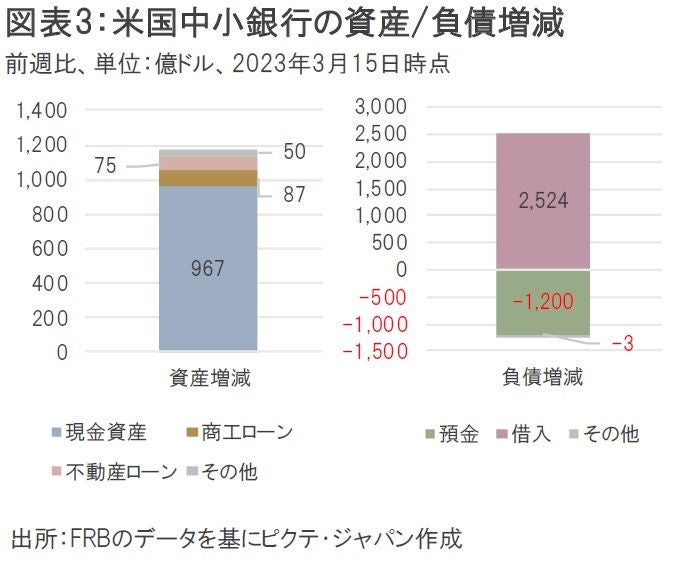 3月9~15日時点の米国中小銀行全体の負債増減(前週比)を見ると、「預金」が1,200億ドルのマイナスとなった一方、FRBの流動性供給などの「借入」が2,524億ドルのプラスになっており、綱渡りの状態だったことが分かる(図表3)。また、資産増減(前週比)では「現金資産」が967億ドルのプラスとなっており、不測の事態に備えてキャッシュが温存されている様子が窺い知れる。