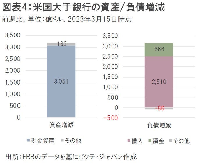 一方、米国大手銀行の負債増減(前週比)では、「預金」が666億ドルのプラスとなったほか、中小銀行のような預金流出が起こっていないはずの大手銀行でも「借入」が2,510億ドルのプラスになった(図表4)。また、資産増減では中小銀行と同様に「現金資産」が3,051億ドルもプラスになっており、大手銀行においても流動性逼迫に備えた対応が取られている。