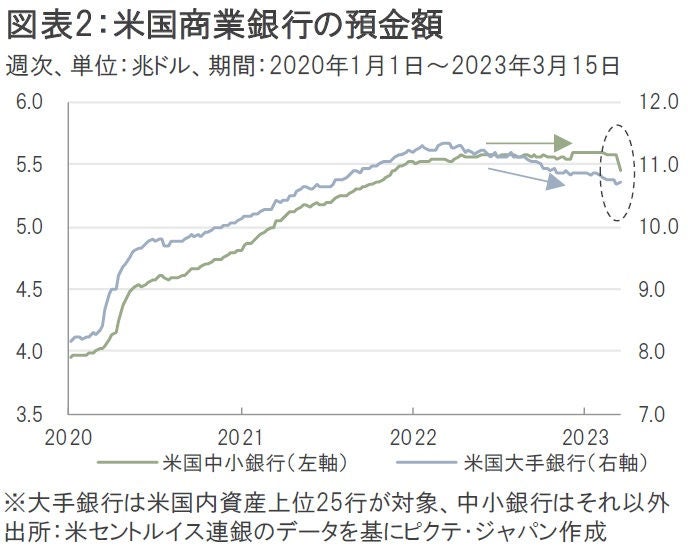 3月24日に発表された9~15日の米国中小銀行における預金流出額は、統計開始以来で過去最大の約1200億ドルとなった。一方、米国大手銀行の預金は約666億ドルの流入超となっており、中小銀行から大手銀行へ預金が急激にシフトしたことがうかがえる。しかし、大手銀行で預金が流入したのは1月19~25日以来の出来事であり、これまで預金が流出していたのはむしろ大手銀行のほうだった(図表2)。
