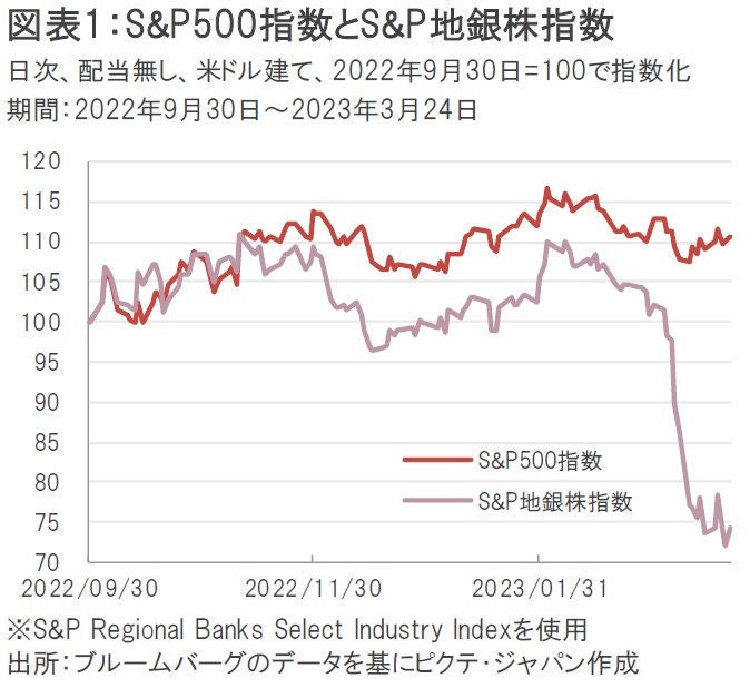 先週1週間のS&P500指数は、UBSによるクレディ・スイス・グループ(CS)救済買収等をきっかけに前週比1.39%高となり、やや値を戻す展開となった(図表1)。しかし、今回の金融不安のきっかけとなった米地銀株で構成されるS&P地銀株指数は同0.85%高にとどまっており、本格的な回復局面に入ったとは言い難い。