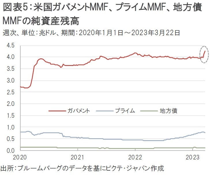 米国の中小銀行から大手銀行へ預金の一部がシフトしたことに加えて、米国ガバメント・マネーマーケット・ファンド(MMF)にも一部資金がシフトした可能性がある。3月22日時点の米国ガバメントMMFの純資産残高は約4.3兆ドルとなっており、前週から1,318億ドルも残高が急増した(図表5)。