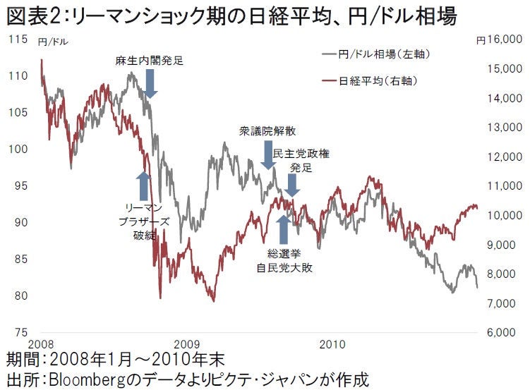 衆議院の任期が残り1年に迫るなか、2008年9月24日に就任した麻生太郎首相(当時)は、即座に国民に信を問うと見られていた。しかし、9月15日にリーマンブラザーズが破綻、円高が進み、株価が急落したのである(図表2)。
