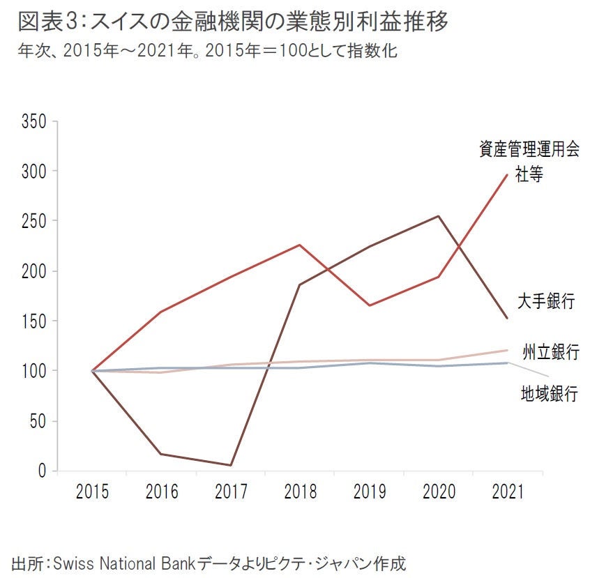 大手行が投資銀行業務を拡大してきたのは、他国同様、地元密着の地域銀行との競争が背景にある。さらにスイスの場合、2つの特殊事業がある。スイスは、日本に次ぐ低インフレの国で、その分低金利である。このため利鞘は総じて低く、かつ2007年以降毎年、約5bp(1bp=0.01%)ずつコンスタントに下落し続けている(SNBのFinancial System Report 2022より)。次に、総資産シェアで20%を有する州立銀行の存在である。州立銀行は、州政府が3分の1以上の資本と議決権を有する。今でも一部は州の保証を有するため、預金吸収などに有利である。以前からCS等はこうした特権を批判していた(例えば2020年9月12日付ロイター記事)。