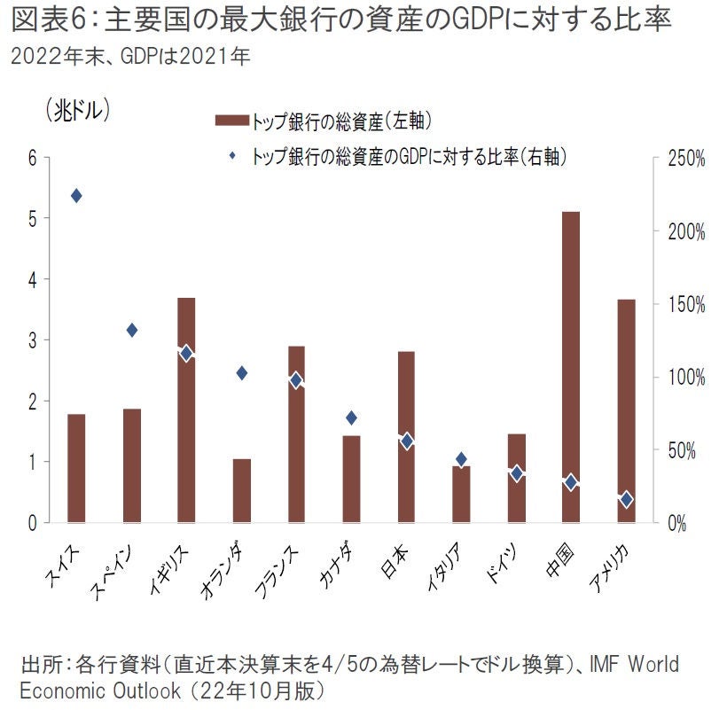 両行統合後の新UBSグループの総資産は、単純合算で240兆円程度となる。これは、2021年のスイスのGDPの約220%に当たる。主要国で銀行の規模がこれだけ大きな国は他には見られない(図表6)。
