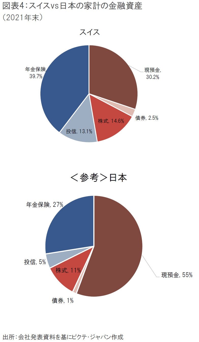 これに対し、州立銀行や地域銀行の利益は極めて安定的に推移している。また、資産運用会社の収益は成長を実現しつつ、大手2行よりは安定的に推移している。現在スイスの金融機関が管理運用する預り資産額は、約3.3兆CHFに上り、世界の運用資産ランキングでトップを維持している(Deloitte International, 2021)。資産運用の強さは、以前からのスイス国内での強さに海外での評判が加わったものだ。実際、スイスの家計資産の約70%は株式、投信、年金保険であり、これらの資産の大半がスイスの国内系の運用会社に託されているとみられる(図表4)。