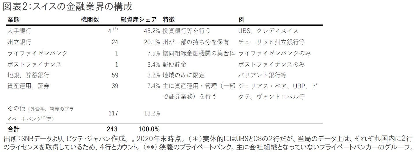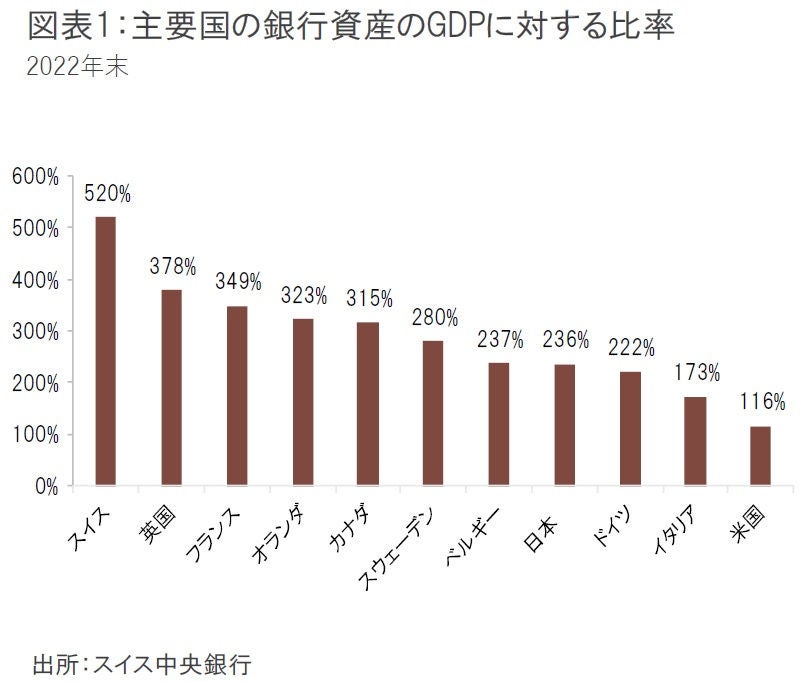 スイスの銀行業界の総資産は3.9兆スイスフラン(CHF) に上り、GDPに対する割合は 520%と先進国中トップとなっている(図表1)。