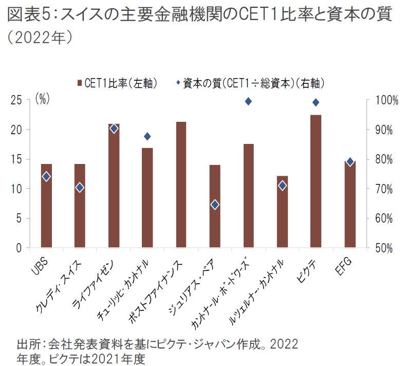 まず、質の高い資本とされるCET1(普通株式等Tier1)は、全行で、所要最低比率(国際重要行で10%、スイスの国内重要行で8.56%)を上回っている(図表5) 。また、CET1が総資本に占める比率も、UBSとCS以外は概ね高い。資産の流動性を示す流動性カバレッジ比率は高い水準を維持している。