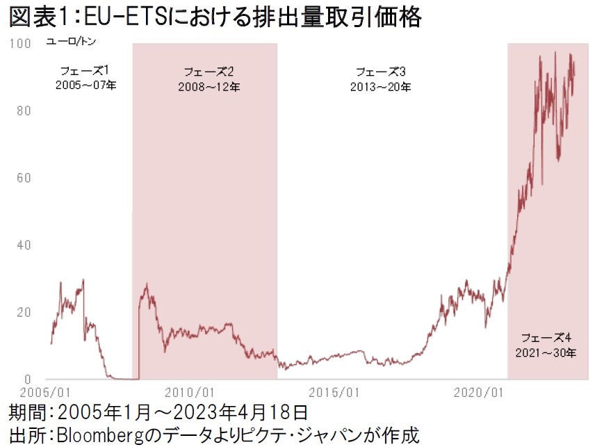 EUは温室効果ガス対策のフェーズ4、即ち2021~30年までの10年間に関し、当初、排出量の削減目標を1990年比40%としていた。しかし、2020年12月17日、EU理事会は55%削減と目標を大きく引き上げている。結果として、未達になる事業所が急増するとの思惑から、EU-ETS(欧州排出量取引市場)における排出量価格は急騰した(図表1)。