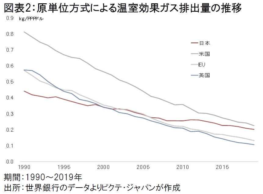 しかしながら、例えばGDP1単位を産み出すのに必要な温室効果ガスの排出量を国・地域別に比較すると、2000年代に入って欧州に抜き去られた(図表2)。さらに、米国が日本の背後に迫っている。日本が自らを「環境大国・省エネ大国」と考えるのは、最早、実態に合わなくなっているのだ。