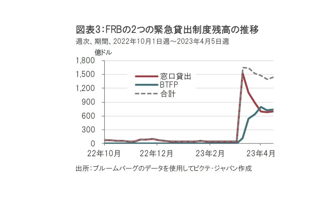 一方で、FRBが用意している2つの緊急貸出制度である(連銀)窓口貸出制度と、銀行タームファンディングプログラム(BTFP)は足元、再び利用が増えています。金融不安の落ち着きを示す証拠は確かに増えていますが、不安が完全に解消されたと判断するにはもうしばらく時間がかかりそうです。金融不安が長引けば景気への悪影響も強まることが想定されます。