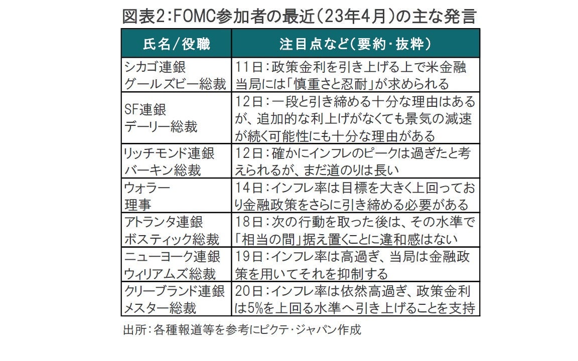 5月のFOMC(2-3日)を前に、FOMC参加者が金融政策に対する発言を控えるブラックアウト期間が4月22日から開始されます。ブラックアウト期間直前のFOMC参加者の主な発言を振り返ると(図表2参照)、次回のFOMCでは0.25%の利上げ、その後は当面、政策金利を据え置くという考えが多いように思われます。