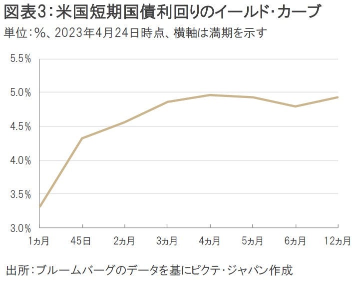 米国株式市場やVIX指数は落ち着いているものの、米国短期国債市場では「Xデー」前の1ヵ月物の利回りが急低下する一方、それ以外の満期の利回りは上昇しており、すでに債務上限問題を警戒した動きが見て取れる(図表3)。